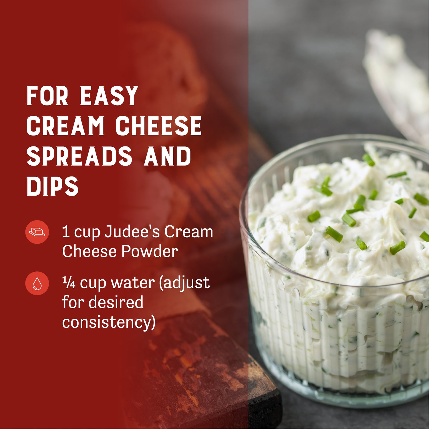 Easily convert powder for cream cheese spreads and dips by combining 1 cup Cream Cheese Powder with 1/4 cup water (adjust for desired consistency).