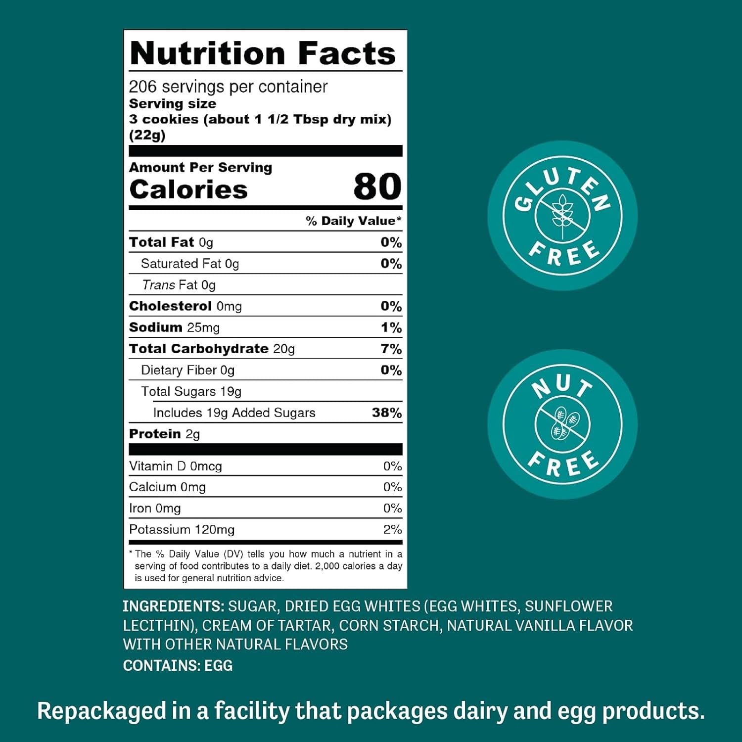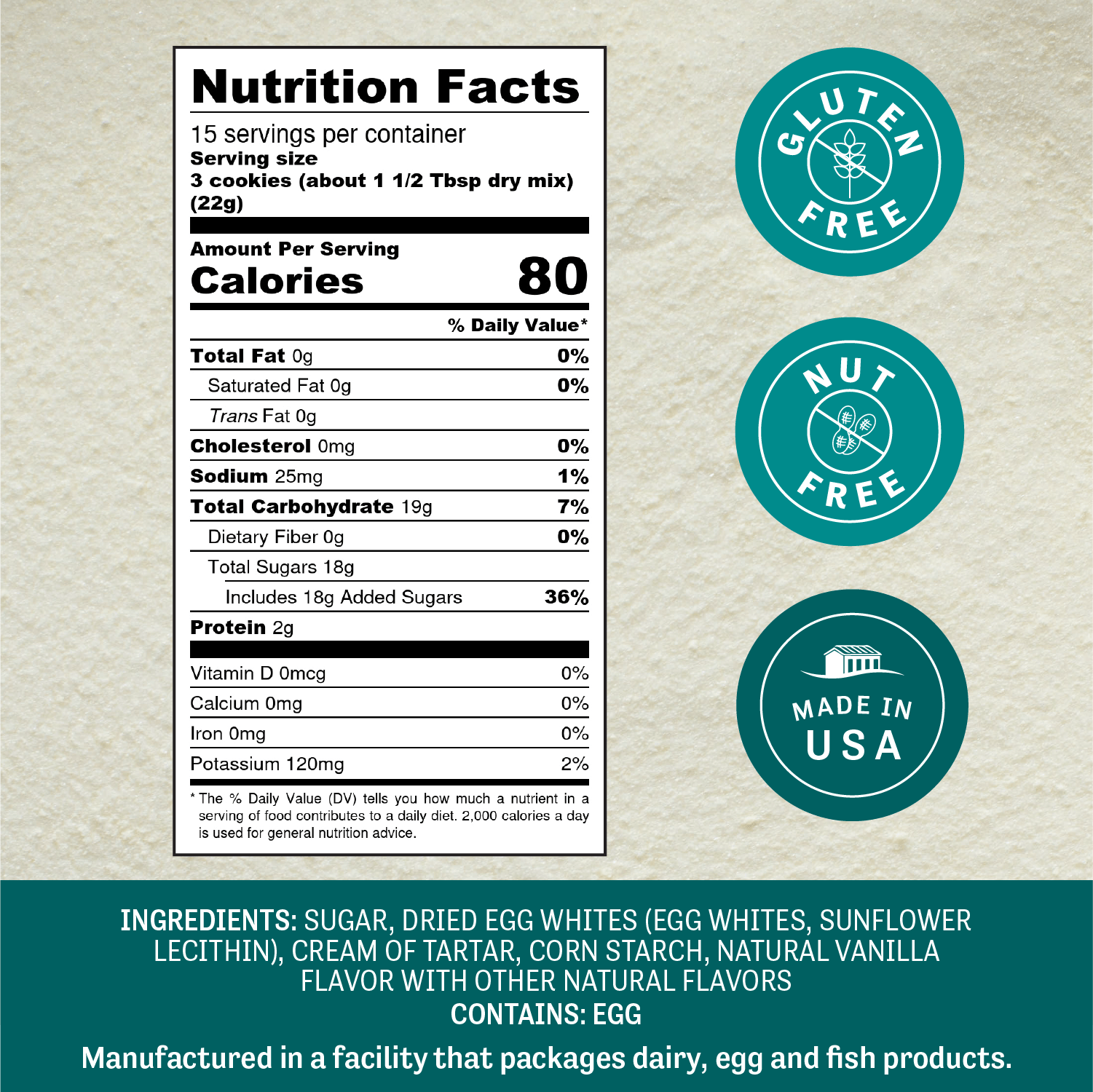 Sugar, Dried Egg White Powder, Cream of Tartar, Corn Starch, Vanilla Flavor