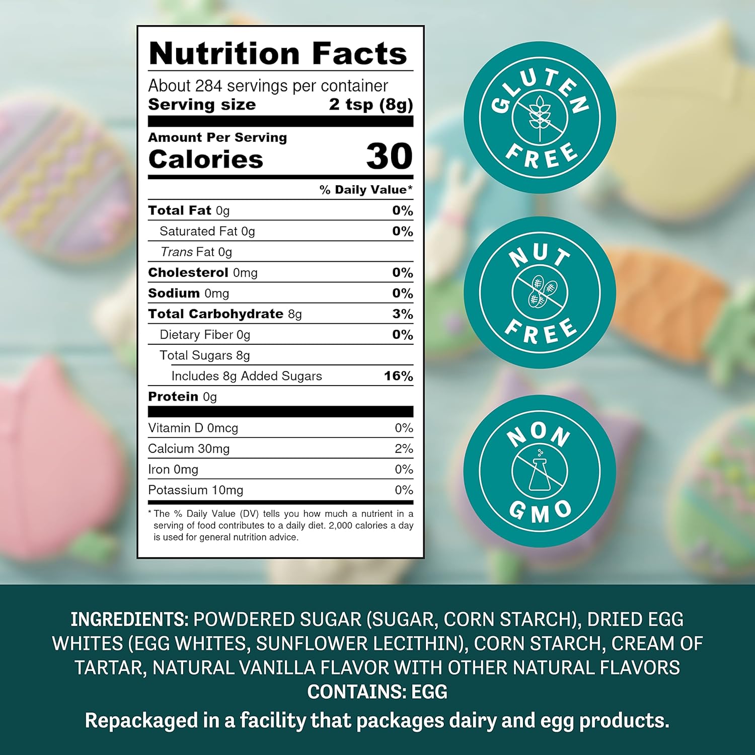 6X Powdered Sugar, Dried Egg Whites (Egg Whites, Sunflower Lecithin), Cream of Tartar, Corn Starch, Natural Vanilla Flavor with Other Natural Flavors