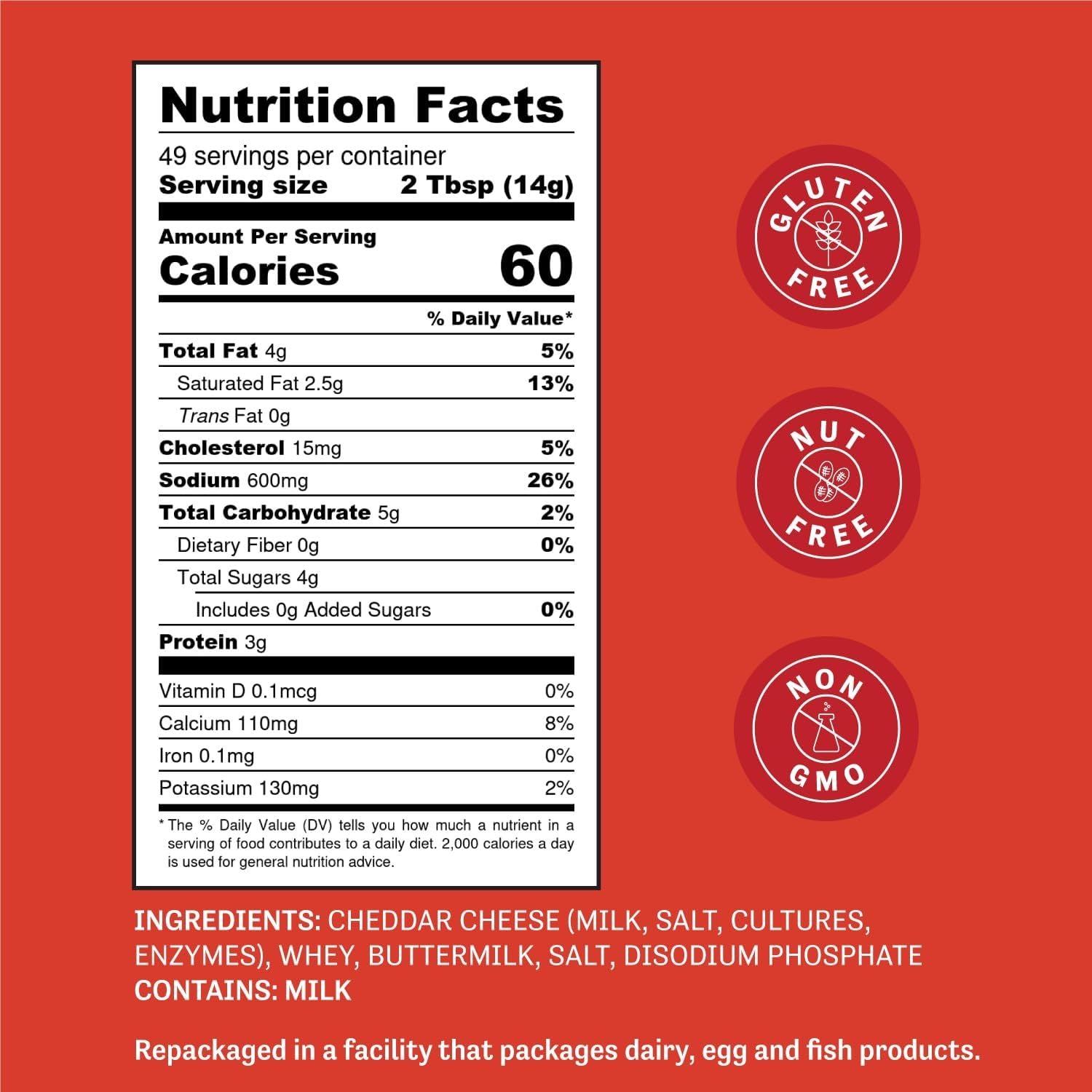 Pure Quality, USA-Made – Trust in a product that aligns with your lifestyle. Proudly made in the USA in a dedicated gluten-free and nut-free facility, our white cheddar powder offers a reliable, shelf-stable solution for everyone from fitness enthusiasts looking for a "protein cheese" boost to home chefs crafting five-star meals.